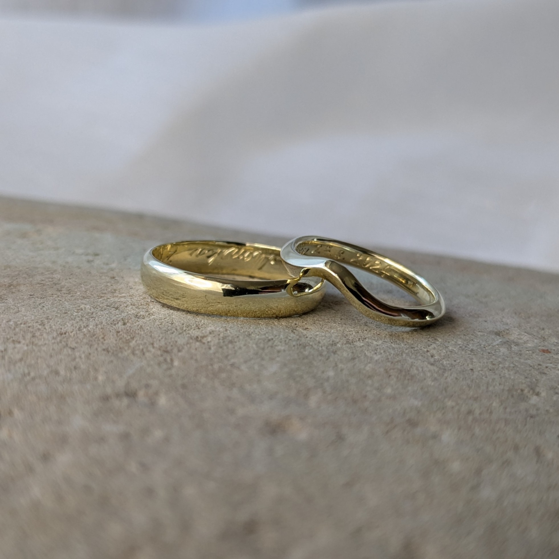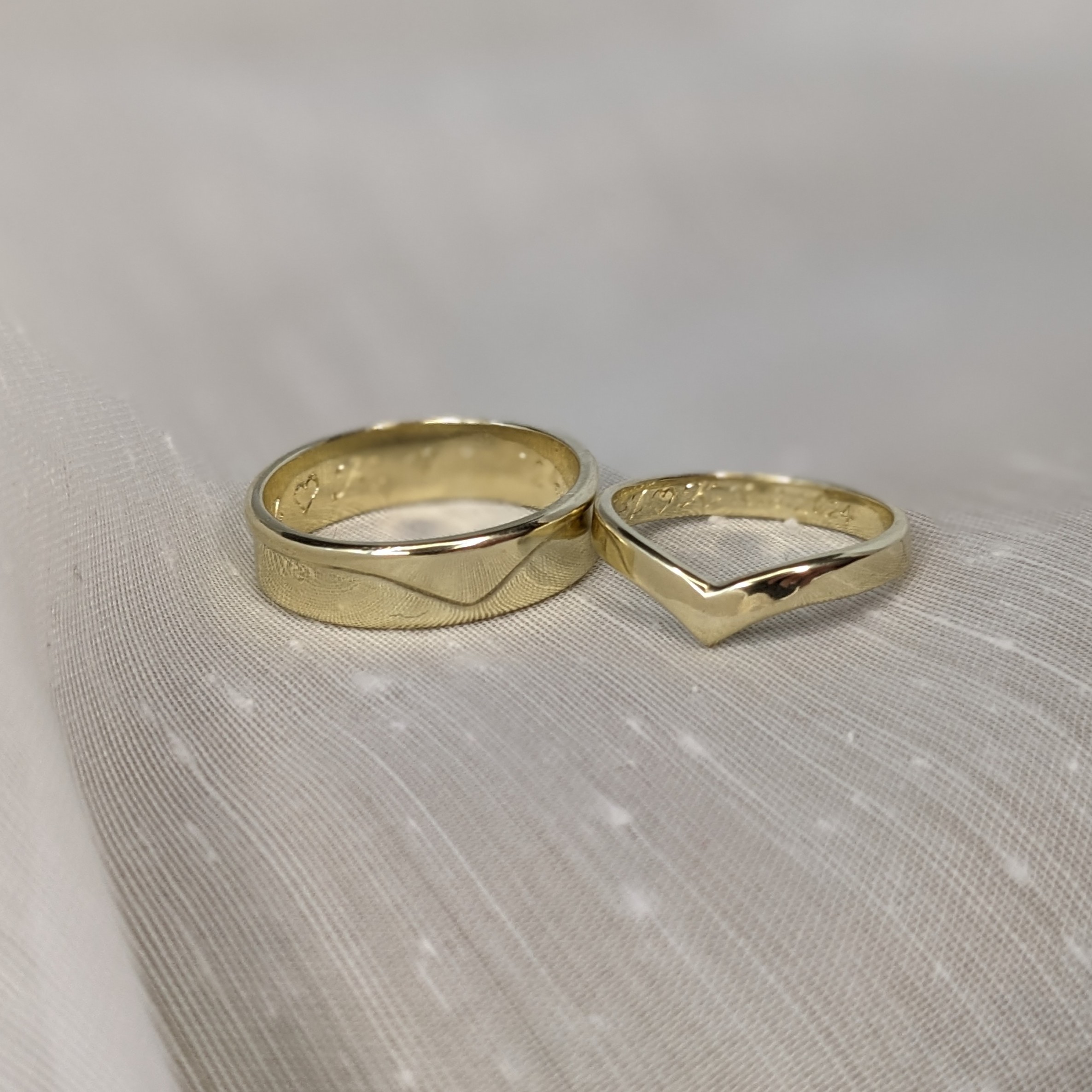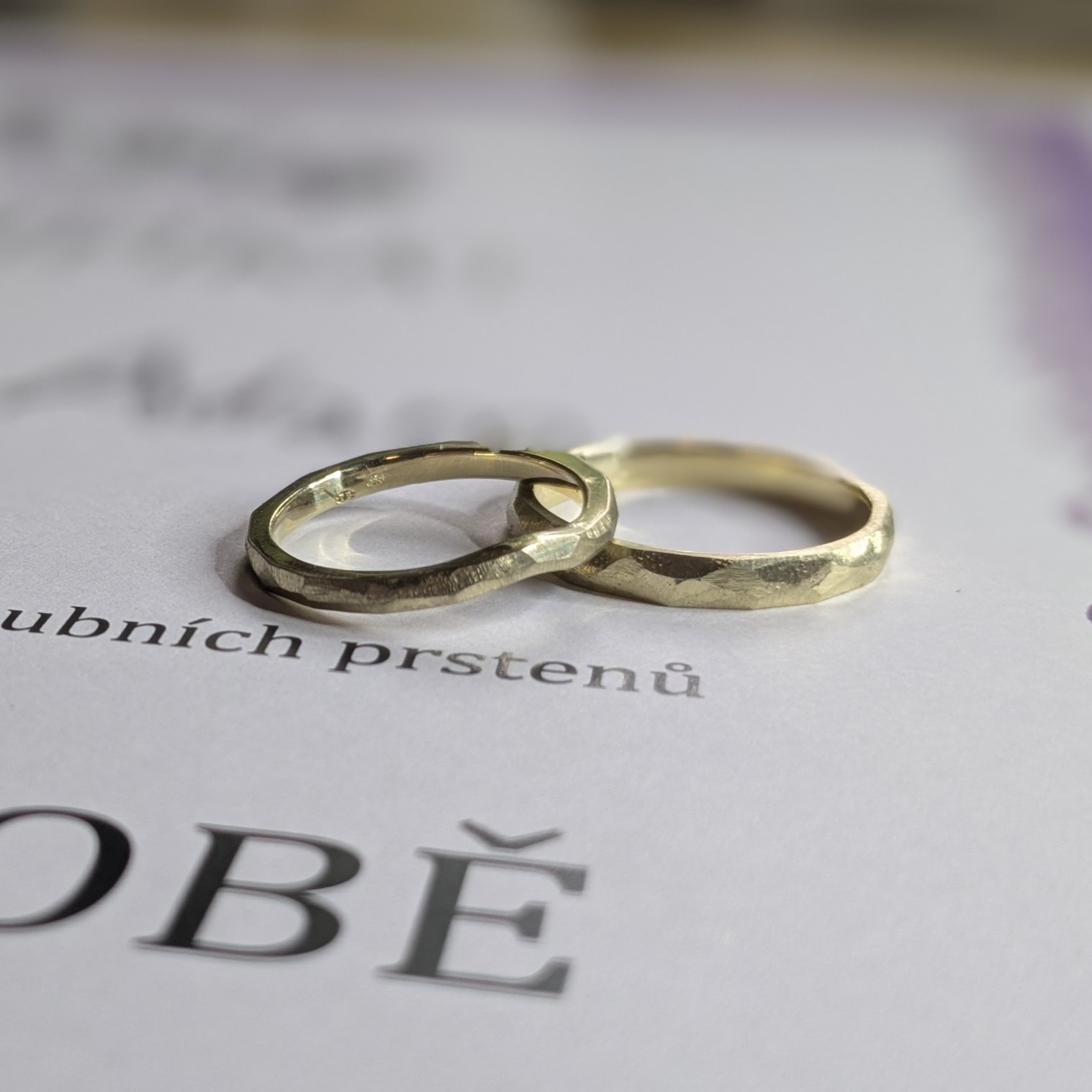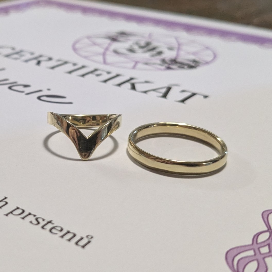 - Prsteny ze žlutého zlata – pánský ze dvou vrstev, dámsky do špičky